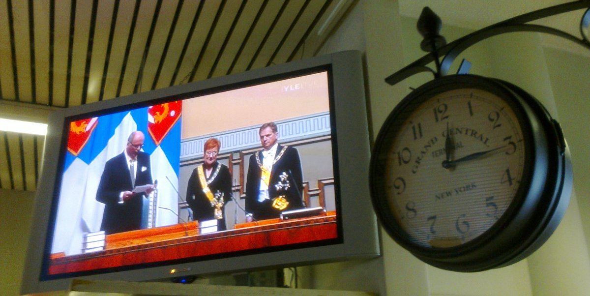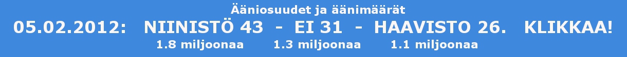 keskiviikko.fi - 2012/03/07 -  Kuva. Rahaa! - Pikavippien kieltoaloite eduskunnassa, - Kuva. 4 koiraa lumisella kadulla taitavan taluttajan ohjauksessa. - Kuva: Harrastakaa! - "Hakkarainen, kalsarit ja Ilta-Sanomat" - Kuvia. Jyväskylä 7's Snow Rugby Tournament 2012. Kuva. "Baanalle on päästävä maaliskuun alun aurinkoisena päivänä." - Kuva. "GRAND CENTRAL TERMINAL HELSINKI torstaina 2012-03-01 12:15." - Eduskunnan puhemies Eero Heinäluoma puhuu vieressään väistyvä presidentti Tarja Halonen vieressään alkava presidentti Sauli Niinistö. Kuvan kello käy Suomen aikaa Café Laukaassa Keski-Suomessa ja viiden minuutin päästä lähtee bussi, johon kuvaajan Pertti Mannisen on kiirehdittävä. Kellossa: GRAND CENTRAL TERMINAL NEW YORK. - Karkauspäivänä. Kuvat:  Kuntolenkki - Kuva. M ROOM - ajaton parturi - Yle saamelaisten kansallispäivänä. Osa 7. Oddasat. Suomen uudeksi presidentiksi on valittu kokoomuksen Sauli Niinistö. - Niinistö sai 43 prosentin kannatuksen koko maassa. Koko kansan presidentti? - Tutkimusjohtaja Rahkonen sekoilee.  Gallup. Taloustutkimus. Ennusti muka niinistön voiton jo vuosia sitten! - TOP 20 - Tammikuu 2011 - Nettisanomat/ Sanomanetti-sivustot. Eri kävijät. - Presidentivaalit 2012 - Kuvia - Tulos: Ääniosuudet ja äänimäärät pyöristettyinä: Niinistö 43 8 (1. 8 miljoonaa), EI 31 (1.3 miljoonaa), Haavisto 26 (1.1 miljoonaa) -  Kuvat. "01.01.2012".  -- Lukijan kuva: "Katso tuolla on Hakkarainen!" - Kuva. Käden ojennus. Karuselli. -tiistai 28.02.2012 - etusivu - Nettisanomat - Sanomanetti - Blogi: Viikkosanomat.fi - Kuvasanomat - Sanomatori  - Viikkosanomat - Härkää sarvista - Pikavippi pikavipit - kielto - eduskunta - aloite